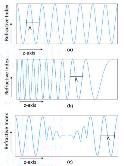 Periodic variation of the refractive index with respect to the fiber z-axis (fiber length). (a) Uniform POFBG; (b) Chirped POFBG; and (c) PS-POFBG.