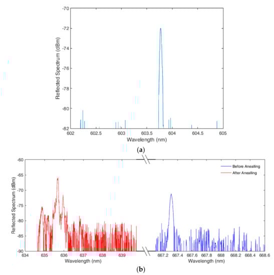 (a) Reflection spectrum of the uniform POFBG inscribed at 604 nm with the KrF pulsed laser 248 nm; (b) Reflection spectrum of the uniform POFBG inscribed at 667 nm and the same grating after the post-annealing process.