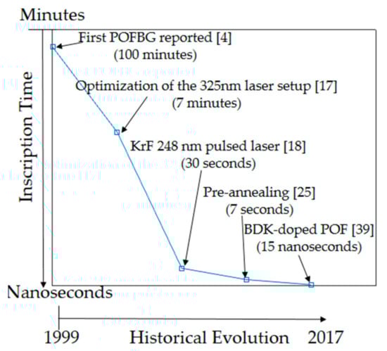 Another breakthrough concerning the reduction of inscription times is related to the possibility of doping the fiber. Such dopants can increase the POF photosensitivity, which leads to a significant reduction of the inscription time. Among the BDK and TS dopants cited in Section 2, the BDK is a photo-initiator, which presents an absorption coefficient higher at wavelengths shorter than 325 nm that leads to a very fast triggering of the photo-polymerization on the fiber. By adding BDK on a PMMA POF, it was possible to produce a uniform POFBG with a single laser pulse with the KrF 248 nm laser [], which represents an inscription time in the order of 15 ns. In order to clarify and present some breakthroughs related to the enhancement of the inscription time of uniform POFBGs, Figure 4 presents the historical evolution of the POFBGs inscription time with the phase mask technique, where some reasons or breakthroughs related to such evolution are presented. The goal here is to present the evolution inscription time reduction throughout the years. Since the POFBGs inscription with the fs laser by the phase mask technique was only recently reported and presented inscription times longer than the ones of the KrF laser, such results with the fs laser are not presented, but it is worth mentioning that inscription times as short as 40 s are reported [].