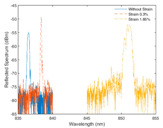 Different types of POFBGs have been inscribed with the setup presented in Figure 1. The first chirped POFBG on undoped fiber was inscribed with a chirped phase mask, where its responses with respect to the temperature, strain, and pressure were characterized []. However, by applying a chirped phase mask, the chirp parameters of the grating are limited to the ones of the phase mask and different chirped phased masks are necessary to obtain different chirp parameters, which can make the technology very expensive. For this reason, a different technique to obtain chirped POFBG was proposed in []. The technique relies on tapering the POF to obtain the chirp, which is obtained by the fiber etching on a container filled with acetone. Such a process greatly improves the flexibility on chirped POFBGs manufacturing. In addition, a BDK-doped POF was employed in [] and the chirped POFBG was obtained with a single laser pulse using a uniform phase mask. Figure 5 presents the reflection spectrum of the chirped POFBG inscribed with the method described. In order to show the chirped POFBG tuning with strain, Figure 5 presents the same chirped POFBG when a strain of 0.3% and 1.85% is applied. Note that the grating was inscribed with a 0.3% strain, so when we released or applied strain, we could achieve different chirp values.