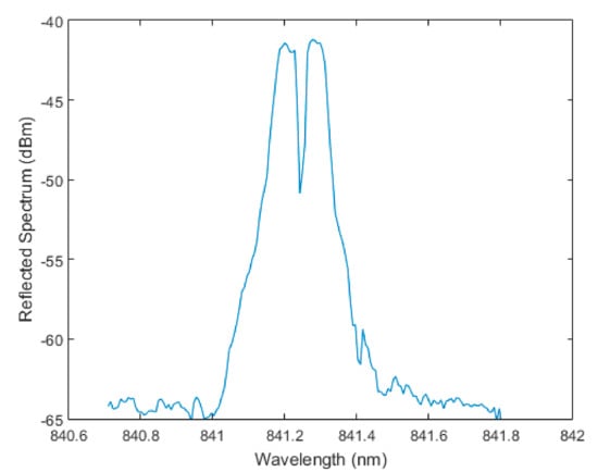 Although the first POFBG reported was inscribed with both a 325 nm and 248 nm laser, a periodic ablation on the fiber was reported for the 248 nm laser inscription []. For this reason, the continuous HeCd laser at 325 nm was the preferred option for gratings inscription applications for many years. The resonance wavelength of such POFBGs is generally around 1550 nm [] due to the availability of low cost telecom equipment at this wavelength region []. Although some polymers are chemically modified by adding different organic combinations, such as the perfluorinated compounds, resulting in the commercially known Cyclic Optical Transparent Polymer (CYTOP) POFs that present low losses on the 1500 nm region [,], in general, the materials employed in POFs present higher attenuation losses in this wavelength region []. Nevertheless, there is a considerable decrease of the material loss in the wavelength range of 850 nm [] and with the development of the complementary metal-oxide-semiconductor (CMOS) technology, it is possible to obtain interrogation systems with a lower cost than the one of the 1550 nm region (L band) [].