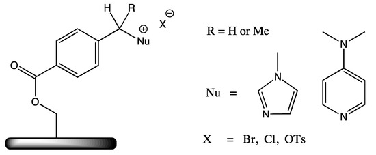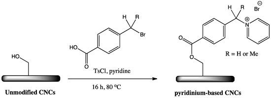 In a further attempt to decrease the number of synthetic steps and make the synthetic design more amenable for potential industrial applications, the Thielemans group also developed a simple and heterogeneous one-pot synthetic route for the preparation of cationic pyridinium-grafted CNCs [63]. Unmodified CNCs were treated with 4-(bromomethyl)- or 4-(1-bromoethyl)benzoic acid in the presence of p-toluenesulfonyl chloride and pyridine to append the cationic pyridinium groups on the CNCs’ surface (Scheme 8). The grafting involves an esterification reaction between the activated 4-(1-bromoethyl/bromomethyl) benzoic acid as their mixed anhydrides and CNCs and a nucleophilic substitution of the bromide with pyridine (pyridine alkylation type reaction). Purification of the resulting cationic CNCs was achieved by Soxhlet extraction with dichloromethane and ethanol for 24 h to get rid of any unbound reactants.
