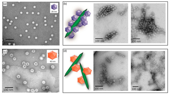 TEM images of (a) CCMV viruses in water; (b) Complexes of CNC-g-P(QDMAEMA) and CCMV in water; (c) NoV-VLP in 500 mM NaCl stock solution; (d) Complexes of CNC-g-P(QDMAEMA) and NoV-VLP at 200 mM NaCl. (Reproduced from reference [47] with permission from the Royal Society of Chemistry, copyright 2014).