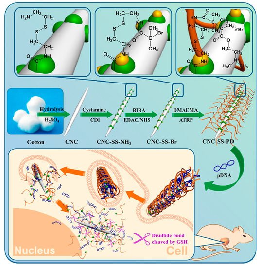 PDMAEMA was reported to effectively condense plasmid DNA into nanoparticles to aid cellular internalization for gene delivery applications [76,77]. Taking advantage of this property, Hu and co-workers designed cationic CNC-based gene vectors by wrapping the surface of CNCs with disulphide bond-linked dense PDMAEMA brushes [78]. Prior to SI-ATRP with PDMAEMA, sulfated CNCs were modified in two steps: (i) reaction of cystamine with CDI-activated CNCs to afford CNCs-SS-NH2 (ii) amidation reaction of CNC-SS-NH2 with α-bromoisobutyric acid (BIBA) to generate bromoisobutylryl-terminated CNCs (CNC-SS-Br) (Figure 4). The resulting CNC- graft-PDMAEMA vectors (CNC-SS-PD) were evaluated for their gene condensation abilities, reduction sensitivities, cytotoxicities, gene transfection efficiencies, cellular uptake, and the in vitro and in vivo antitumor effects. The release of plasmid DNA was achieved by degrading the disulphide linkage under reducing conditions. Low cytotoxicities, high transfection efficiencies, and good activity in inhibiting the growth of tumors and cancer cells rendered the rod-like CNCs with biocleavable PDMAEMA side-chains as good candidates for gene/drug delivery systems.