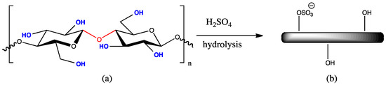 Preparation of sulfated cellulose nanocrystals (CNCs) via acid hydrolysis of cellulose ((a) native cellulose; (b) diagrammatic representation of rod-like sulfated CNCs).