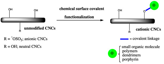 Feese et al. reported the preparation of cationic CNCs that was surface-modified with a cationic porphyrin [55]. The porphyrin
