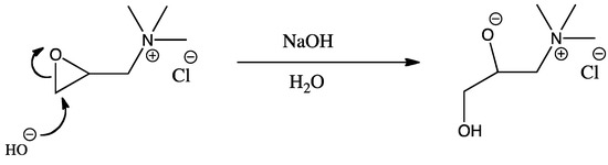 In order to circumvent the issue of a low total surface charge density of the above cationized CNCs, Zaman and co-workers proposed an aqueous semi-dry method using a similar synthetic strategy as depicted in Scheme 3 [49]. In their study, dried sulfated CNCs were ground with powdered NaOH, then mixed with the solvent (H2O or H2O/DMSO mixture at different volume ratios) followed by dropwise addition of the EPTMAC. The impact of the amount of water on the cationization efficiency was thoroughly studied. In the presence of a high water content, a likely side-reaction such as alkaline hydrolysis of EPTMAC could occur (Scheme 4), thereby consuming the key reagent for the desired etherification reaction [50]. Although surface cationization of CNCs by the semi-dry process proceeded with an increase in the surface charge density over the unmodified CNCs, no X-ray diffraction (XRD) data was reported to assess any loss in crystallinity and the associated structural integrity of the nanocrystals [29].