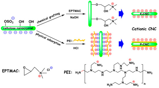 Synthetic route for the preparation of cationic CNCs by chemical grafting and physical adsorption (Reproduced from reference [51] with permission from the American Chemical Society, copyright 2016).