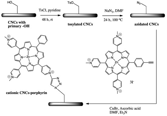 was covalently conjugated onto the CNCs’ surface via the powerful Huisgen 1,3-dipolar cycloaddition reaction (Click chemistry). This Click reaction involves the coupling of an azide with a terminal alkyne to link two molecules via the formation of the stable 1,2,3-triazole ring [56,57]. The CNCs used in this study were obtained by HBr hydrolysis of cotton fibers (Whatman #1 filter paper, 98% α-cellulose, 80% crystallinity) at 100 °C. The primary hydroxyl groups of CNCs were first transformed to tosylates (-OTs) leaving groups for subsequent SN2 displacement with nucleophilic azide groups using sodium azide in dimethylformamide to afford surface reactive azidated CNCs (Scheme 6). While no data was provided on the degree of tosylation, the azidation occurred with a degree of substitution of 0.14 based on elemental analysis data. The next step in the synthesis involved the appendage of the cationic porphyrin unit on the surface of the CNCs under Click reaction conditions to chemically join the ethyne-bearing porphyrin to the azidated CNCs. The purified insoluble green cationic CNCs were obtained after isolation by several careful washes and centrifugations to remove unreacted materials and the copper catalyst [58] followed by freeze-drying of the aqueous suspensions. Proof of covalent conjugation between the cationic porphyrin and CNCs was confirmed using infrared spectroscopy (a decrease in the intensity of the azide band at 2113 cm−1 and an increase in C=N band intensity at 1651 cm−1 originating from the porphyrin and triazole linkage) and diffusion NMR spectroscopy, and supported by thermogravimetric analysis and gel permeation chromatography. While the presence of the porphyrin fragments on the surface of the CNCs is an indication of the cationic nature of the modified CNCs, the success of the surface cationization was not further confirmed by electrophoretic mobility measurements.