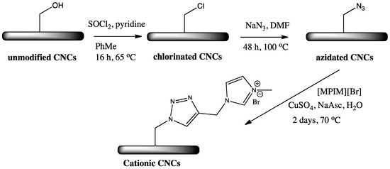 Eyley and Thielemans designed cationic CNCs in a three-step synthetic strategy using the robust Click chemistry to append imidazolium cations on the surface of CNCs (obtained by 64 wt % sulfuric acid hydrolysis of bleached cotton) [59]. Chlorination of the primary hydroxyl groups with thionyl chloride was first achieved followed by reaction with sodium azide to afford surface-reactive azidated CNCs. Although the tosylate is a better leaving group than the chloride, chlorination was preferred over tosylation as the first step of the synthesis due to prior inconsistent results of heterogeneous tosylation reaction on cotton [60,61]. The ionic liquid 1-methyl-3-propargylimidazolium bromide ([MPIM][Br]) [62] was then reacted with the azidated CNCs under Click reaction conditions to generate the desired cationic imidazolium grafted CNCs (Scheme 7). The presence of the imidazolium fragments on the surface of the CNCs was confirmed by infrared spectroscopy and X-ray photoelectron spectroscopy (XPS). Using nitrogen concentration by elemental analysis, a degree of substitution of 0.36 was calculated for the grafting of the imidazolium, however, the extent of surface modification for the azidation step was not reported. The zeta-potential of the imidazolium-grafted CNCs was found to be +47 mV (v/s −9.49 mV for unmodified CNCs), thereby indicating a cationic surface (surface charge density of 1.17 enm). Examining the crystallinity of the products at each stage of the surface functionalization is crucial to ensure no damage to the nanocrystals’ structure and properties. The authors were able to successfully monitor the crystallinity of each product using powder X-ray diffraction (XRD) technique. A constant value of the crystallinity index at each stage of the surface modifications was observed except for a slight decrease from 0.89 to 0.80 for the chlorination step. Furthermore, it was possible to exchange the bromide anion with bistriflimide and the monoanionic orange II dye, thereby allowing the design of a number of ion exchange systems or catalysts using CNCs as a support template.