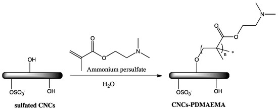 Preparation of CNCs grafted PDMAEMA via free radical polymerization. (Adapted from reference [75] with permission from the American Chemical Society, copyright 2014).