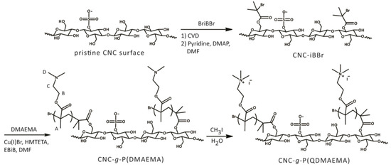 In a recent study, Rosilo and co-workers developed an efficient method for shielding the anionic sulfate half-esters of CNCs using SI-ATRP as the key step to introduce poly P(DMAEMA) brushes on the surface of CNCs [47]. Pristine CNCs were first modified with initiator molecules via the chemical vapor deposition (CVD) method to form CNC macroinitiators with high-density initiator sites for subsequent grafting of P(DMAEMA) in dry DMF at 70 °C in the presence of ethyl α-bromoisobutyryl bromide (EBiB) as the sacrificial initiator. Cationization occurred when the polymer brush-modified CNC-g-P(DMAEMA) was further quaternized with methyl iodide in pure water (Scheme 10).