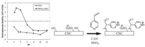 One-pot aqueous ceric ion surface-initiated graft polymerization of 4-vinylpyidine with sulfated CNCs and the effect of pH on the electrophoretic mobility of unmodified CNCs and P4VP-g-CNCs (Adapted from reference [69] with permission from the American Chemical Society, copyright 2013).