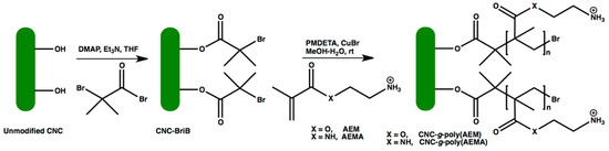 SI-SET-LRP is a robust and versatile copper (0)-mediated living radical polymerization technique for the design of multifunctional materials with complex macromolecular architectures [79,80]. Compared to other living radical polymerization methods, SET-LRP is simple to conduct and it occurs at ambient temperature or below with fast polymerization rates. Metal catalyst removal is quite challenging in other polymerization techniques as residual metal can impede the direct use of the product in many applications. SET-LRP overcomes the above limitation with the use of parts per million levels of catalyst as well as simple catalyst removal from the reaction mixture. Recently, Hemraz and co-workers used the SI-SET-LRP technique to covalently decorate cationic poly(2-aminoethylmethacrylate) (poly(AEM)) and poly(N-(2-aminoethylmethacrylamide) (poly(AEMA)) on CNCs’ surface [45]. Surface hydroxyl groups of sulfated CNCs were esterified using 2-bromoisobutyryl bromide in dry THF at room temperature in the presence of triethylamine as base and catalytic DMAP. The amount of initiator sites on the cellulosic surface was varied by reacting CNCs with 2-bromoisobutyryl bromide at different ratios with respect to the anhydroglucose unit. The obtained initiator-modified CNCs underwent SI-SET-LRP with the cationic monomers (AEM, AEMA), copper (I) bromide, and N,N,N′,N″,N″-pentamethyldiethylenetriamine (PMDETA) in a 1:1 water/methanol mixture at room temperature (Scheme 12).