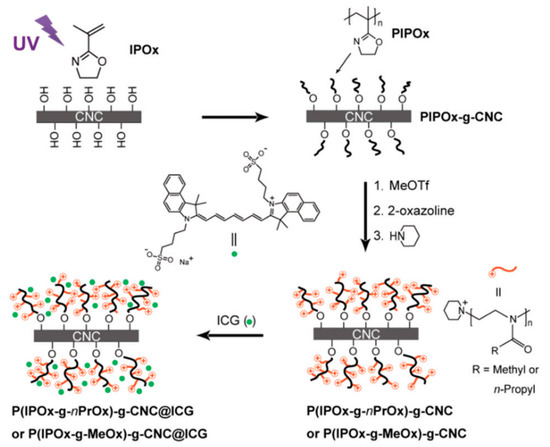 Preparation of poly(2-oxazoline)-modified CNCs using UV-induced photopolymerization and living cationic ring-opening polymerization and subsequent immobilization of indocyanine green (ICG) via electrostatic interactions (Reproduced from reference [82] with permission from the Royal Society of Chemistry, copyright 2017).
