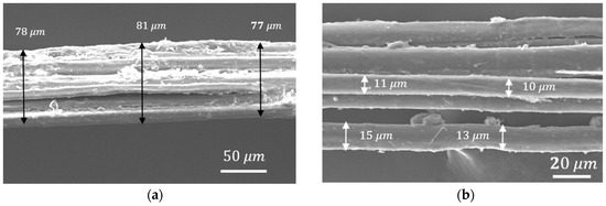 The work of fracture of flax fiber was calculated to be 2.94 × () from Figure 3a using the formula provided by Giorgio Jeronimidis [47] which is an order of magnitude higher than the cellulosic single cell of wood () [48]. This high value of work of fracture of the bundle of single cells of flax fiber is explained by the above fracture surface analysis and can be summarized as follows: