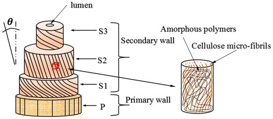 Schematic diagram of a single fiber with primary and secondary layers, secondary layer is composed of S1, S2, and S3 layer. A smaller portion of S2 layer is magnified and cellulose micro-fibrils are seen to be dispersed on an amorphous polymeric matrix. Concept adapted from [12].