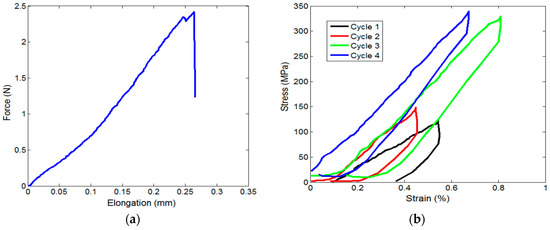 (a) Force-Elongation curve and (b) hysteresis curve of a technical flax fiber. Area under the force elongation curve represents the total energy absorbed during the fracture. Hysteresis curve shows the gradual increase in modulus during each successive loading unloading cycle.