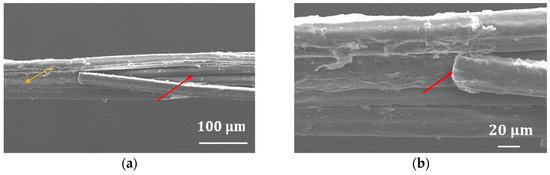 The fractured surfaces that can be seen in Figure 6a are very rough, which is the characteristics of a tensile failure [35]. On the contrary, in compressive failure, the surfaces are usually flat and shiny [35]. The way the outer surface (arrow) is removed bears the evidence of certain degree of rotation (Figure 6a). In Figure 6b, crack has propagated in the longitudinal direction (arrow) and delamination of the meso-fibrils from the hemicellulose matrix can be observed. The meso-fibrils are seen to be pulled out from the matrix in longitudinal direction (Figure 6a,b) as well as in the transverse direction (Figure 6a). Though these meso-fibrils make an angle of approximately 10° with the longitudinal axis, the angle seem to disappear at the fractured region and the meso-fibrils are almost parallel with the axis (Figure 6b). The dimension of meso-fibril is approximately 1.5 (Figure 6a).