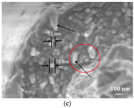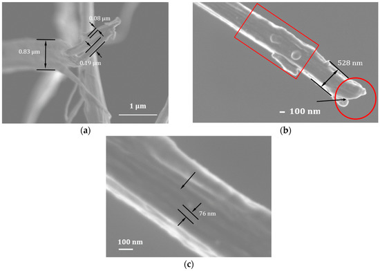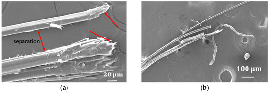 A magnified view of region C is shown in Figure 10c. Crack bridging phenomena usually arises in polymer matrix composites where the fiber and the matrix are both brittle [45,46]. This crack bridging reduces the stress intensity factor ahead of the crack tip and thus decreases the possibility for unstable crack propagation. Similar crack bridging phenomena is observed in the failure surface of flax fibers which also suggests the brittle nature of the micro-fibrils and the hemicellulose matrix. In the image (Figure 10c,d), crack bridging by the micro-fibrils can be observed and the micro-fibrils have been pulled out of the hemicellulose matrix [32]. The micro-fibrils seem to bifurcate (Figure 10c, red circle) near the meso-fibrils (red arrow). However, the meso-fibrils are not very clean and significant amount of matrix material is seen to adhere to the meso-fibril surface. This crack bridging phenomena indicates a poor fiber matrix bond strength of flax fiber. However, this crack bridging by micro-fibrils acts as an energy dissipating mechanism and helps to prevent faster crack propagation in the fiber.