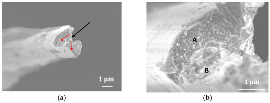 Figure 10a shows the fracture surface of a single flax fiber pulled at 1.6 mm/min displacement rate. The two circles indicate the potential site of crack initiation and the arrow indicates the direction of crack propagation (as flax fibers can be treated as composites) [39]. At the beginning, the velocity of the crack was slow and as a consequence, a relatively smoother surface was created in region A. As the crack continues to propagate, the velocity becomes higher and higher leaving the surface rougher and rougher creating many ridges and rivers in region B [40]. A magnified image is shown in Figure 10b which exposes a crack in region C.