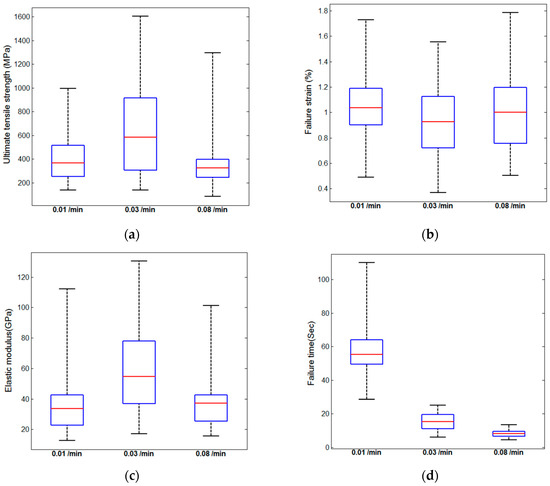 Figure 11a–d shows the distribution of failure strength, failure strain, elastic modulus and failure time of technical flax fibers at three different strain rates, namely 0.01 , 0.03 , and 0.08 . For all box and whisker plots in this study, the red line represents the median. The blue box represents the interquartile range (IQR). The whiskers at the lower and upper end represent the span of all the data points, that is, the range of the data points. Generally, when the data points lie outside the 1.5 times the interquartile range (IQR), they are defined as the outliers. However, due to the relatively small data sets (50 specimens for each strain rate), no values were removed as outliers. All the data points were taken into consideration for calculating the mean and standard deviation [54].