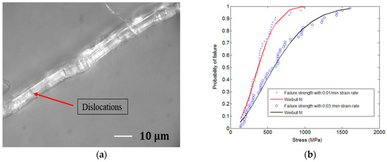 (a) Dislocations or kink bands on single flax fiber; (b) Weibull distribution fit of the data with two different strain rates.