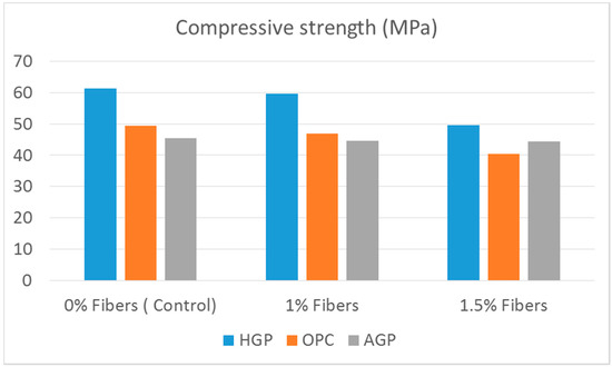 The effect of 1% and 1.5% volume fractions of PVA fiber on the compressive strength of cement and geopolymer composites is shown in Figure 2. It can be seen that the addition of PVA fibers and their increasing volume fractions adversely affected the compressive strength of both geopolymer and composites. Similar results can also be seen in the case of OPC composites. This can be attributed to the possible formation of entrapped pores due to presence of PVA fibers in the geopolymer and cement composites. Similar reduction in compressive strength of polypropylene (PP) fibers reinforced geopolymer composite is also reported by Zhang et al. [28]. It is also observed that unlike the control geopolymer and cement pastes, the PVA fiber reinforced geopolymer and cement composites did not exhibit such catastrophic failure in compression due to bridging of cracks by the PVA fibers as shown in Figure 3. It is also interesting to see that the heat cured geopolymer, regardless of PVA fiber contents, exhibited about 24–25% and about 14–36% higher compressive strength than the cement ambient air cured geopolymer, respectively. The higher compressive strength of heat cured fly ash geopolymer can be attributed to the formation of more geopolymer gels due to heat curing at 60 °C for 24 h. The higher compressive strength of heat cured geopolymer (HGP) composite than the ambient cured geopolymer (AGP) composite is due to heat curing, which accelerated the activation of fly ash with alkali activators in HGP, compared to slow activation of fly ash/slag blend in the presence of alkali activator at ambient temperature. The lower compressive strength of OPC composite compared to that of HGP is also reported by others [29,30].