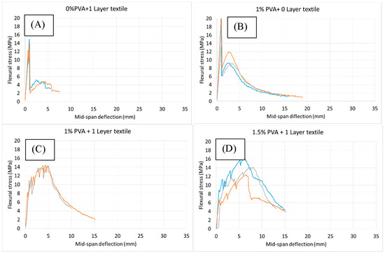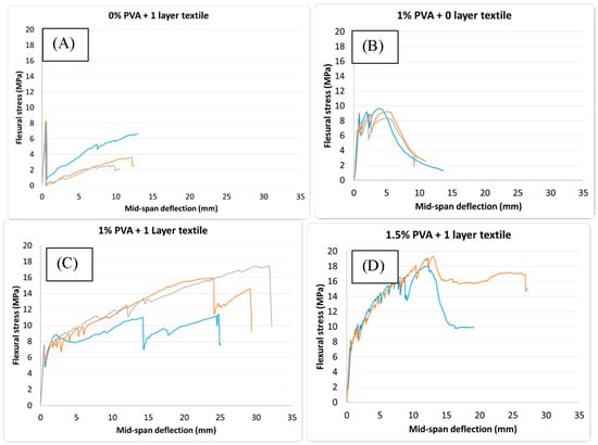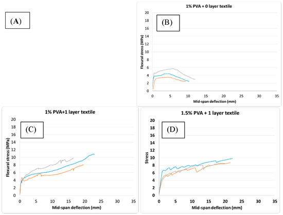 Flexural stress vs. mid-span deflection behavior of heat cured textile reinforced geopolymer (TRG). (A) Composite containing one layer of AR-glass textile, (B) composite containing 1% PVA fibre, (C) composite containing 1% PVA fibre and one layer of AR-glass textile and (D) composite containing 1.5% PVA fibre and one layer of AR-glass textile.