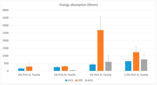 Energy absorption of fiber reinforced cementitious composites is the unique feature during deflection hardening stage as composites exhibit increasing flexural strength with continuing deformation. Extended deflection hardening with high deflection capacity and high flexural load ensure higher energy absorption. The energy absorption of fiber reinforced cementitious composites is not only important under static loads but also under dynamic loadings. Energy absorption capacities of TRC and TRGs containing PVA fibers are the area under the respective load–deflection curves up to peak load of each composite and are shown in Figure 6. It can be seen that by adding 1% PVA fiber, the energy absorption capacities of TRC and both TRGs are significantly improved with further improvement due to increase in PVA fiber from 1% to 1.5%, except in the case of TRC where energy absorption is decreased at 1.5% PVA due to significant reduction in deflection at peak load despite improvement in flexural strength (see Figure 7).