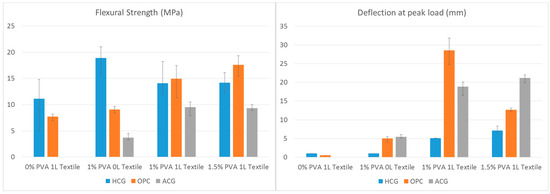 Summary of flexural strength and deflection at peak loads of heat cured TRG, ambient air cured TRG and TRC.