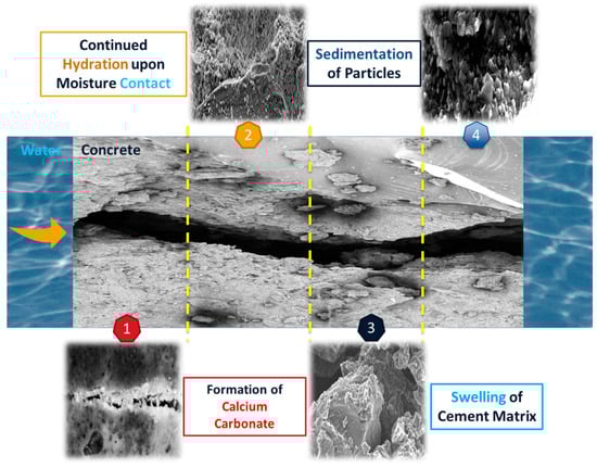 Concrete structures are prone to cracking during their service life. Cracks can be caused by a variety of factors at different stages of their service life such as plastic and drying shrinkage at early age or freeze/thaw cycles at a long-term stage. There are several approaches that can be utilized to limit cracking, such as employing sufficient number of steel bars or fiber reinforcement by implementing an appropriate mix design. However, still some types of cracks are expected. Developed cracks in the concrete matrix create pathways for aggressive agents, such as chlorides, which endanger the structure’s durability and reduce its service life. Hence, it is essential to monitor, control, and repair concrete cracks. Repairing cracks may not always be a feasible task as cracks are not always visible or accessible. As reported, costs related to repairs are also equal to half of the annual construction budget in Europe [1]. In the USA, the annual cost for maintaining existing bridges is around $5.2 billion [2] while in the UK, nearly 45% of the budget allocated for the construction industry is spent for repair and maintenance applications [3]. Besides, indirect costs are associated with concrete crack repair due to loss in production and traffic jam occurrence. Although concrete may be susceptible to cracking, its inherent ability to heal itself to a certain level increases its service-life, thus making this material highly beneficial. This time-dependent phenomenon is called “self-healing” of concrete.