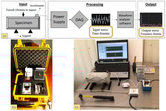 (a) Resonant Frequency Testing using Impact Method (b) Resonance Frequency Testing Equipment (c) Setup for cylindrical specimen (Transverse mode) (Adopted from [18]).