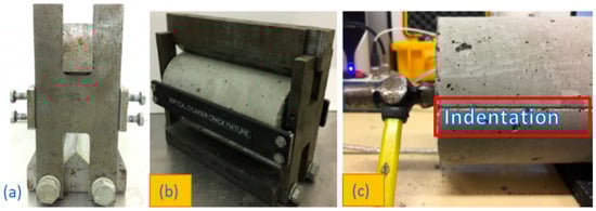 Figure 4a,b shows the Standard Crack Inducing Jig (SCIJ) developed by Gupta and Biparva [29]. This jig houses a Ø100 × 200 mm cylinder between v-shaped cutting edges that act as stress concentrators. Ideally, the SCIJ develops cracks ranging 0.1–0.5 mm in width. For achieving a consistent crack, the authors recommended that the ideal age to induce cracks is between 2–3 days of curing. This is due to the fact that that at earlier age (e.g., 1 day of curing), the concrete fractures in a ductile manner. While at later ages (e.g., 28 days of curing), the crack fracture behaves in a brittle manner. However, it is recommended by the authors to investigate the each mixture by cracking sample cylinders to ensure a consistent generated crack width. Hence, the aim of this study is to investigate the recovered dynamic moduli of macro and micro PFRC during two curing regimes prior to crack induction. For constant testing, the uniaxial tension is terminated as the concrete cylinder cracks for maintaining a constant crack width. With pilot investigation of the suggested cracks for the concrete mixture of this study, cylinders were cracked at 14 days.