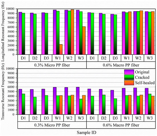 From Table 7, it can be established that micro fiber PFRC exhibited higher resonant frequencies than that of macro fibers PFRC when comparing the original cylinders. Since micro fibers have a high adsorption capacity than that of macro fibers, curing of the PFRC specimen was more prominent when using micro fibers of the same water to cement ratio. With the same mix design, dry-cured PFRC exhibited ~200 Hz lower resonant frequencies than that of water-cured PFRC samples for both macro and micro fibers. For better visualization, data presented in Table 7 also plotted in Figure 5. Moreover, the authors believe that the longitudinal frequencies of self-healed cylinders are higher than there references due to further curing and hydration to 28 days. It is hypothesized that since the specimens were tested with RFT method at 14 days and then cracked, complete hydration of the specimens has not yet been achieved. Hence, due to its high content of un-hydrated cement particles, when they were examined after 28 days wet-curing to determine recovery of dynamic elastic moduli, ongoing hydration was being take place and helped cylinders to attain higher longitudinal frequencies than their references.