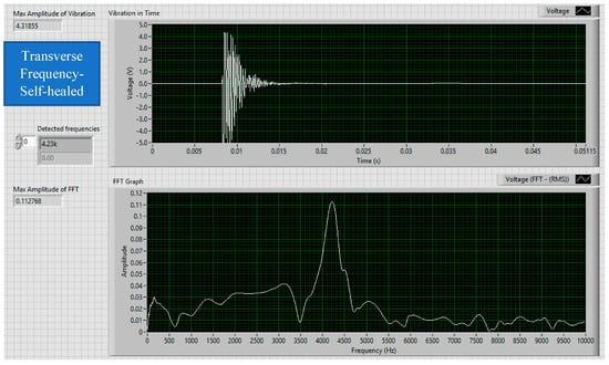 By developing cracks in the cylinders, outlined in Section 2.4.3, both polypropylene macro and micro fibers effectively restrained crack propagation with macro fibers having a better performance in crack width closure. Keep crack widths consistent below 0.05 mm for ensuring that a full recovery can be attained is quite challenging. However, when using fibers, the self-healing of larger crack widths can still be achievable. Although crack widths of the cylindrical specimen used in this study are between 0.10–0.5 mm, partial recovery was observed. The regain in dynamic elastic properties post cracking illustrates the ductility of PFRC composites. An illustration of the frequency recovery is shown in Figure 6, Figure 7 and Figure 8, which indicate the detected transverse vibration and the resulting resonant frequency of the original, cracked and self-healed water-cured micro fiber PFRC cylinder. The measured original transverse resonant frequency, post-cracking and self-healed frequencies are 5.91 kHz, 4.07 kHz and 4.23 kHz respectively.
