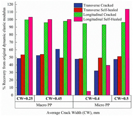 Figure 9 shows the calculated dynamic moduli of PFRC cylinders in transverse and longitudinal modes as a function of crack width. The graph provides the dynamic elastic modulus of cracked and self-healed cylinders averaged from three impacts per cylinder during RFT and normalized to the original (un-cracked) elastic modulus of PFRC cylinders. The results indicated that the fiber size affects the extent and recovery of the PFRC elastic modulus. Macro fibers were more effective in recovering the elastic properties in the longitudinal mode of vibration than micro fibers. On the other hand, micro fibers were more effective in transverse mode elastic recovery. Conversely, the larger fiber size of macro fibers provides a good indication of recovery by bridging larger cracks.