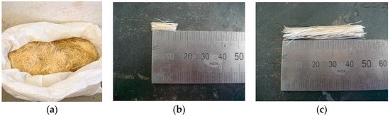 Figure 1 shows the sisal fibres used in the experimental campaign. The sisal fibres had a specific weight of 750–1070 kg/m3 and a diameter ranging between 0.080 and 0.300 mm. Their tensile strength and elongation at rupture were of 230 MPa and 2.08–4.18%, respectively (cf. [19]). The adopted fibre lengths (lf) were approximately 13 and 50 mm.