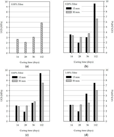 Uniaxial compressive strength for a fibre content of (a) 0%, (b) 0.2%, (c) 0.6% and (d) 1.0%.