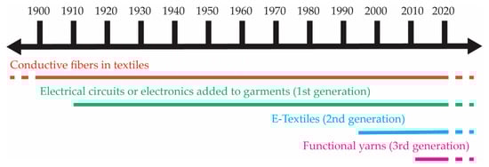 Three different pathways have been used to integrate electronics into textiles. These three distinct generations of electronic textiles are adding electronics or circuitry to a garment (first generation), functional fabrics such as sensors and switches (second generation), and functional yarns (third generation). Prior to the creation of E-textiles there are also many examples of the use of conductive fibers in textile fabrication, going back as far as the second century [13]. A timeline showing the evolution of E-textiles is given by Figure 1.