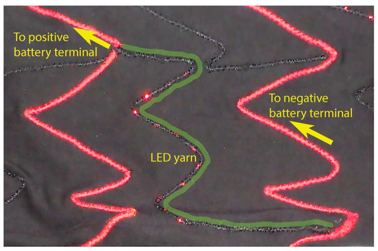 Figure 3. The periphery of the diagram shows long lengths of black E-yarn connected to a lithium polymer battery. Short lengths of LED-yarn were connected in parallel into this main circuit. The diagram shows connections to two lengths of LED-yarn, each containing 12 LEDs. Each LED (KPHHS-1005SURCK, Kingbright, Taipei, Taiwan) required 2 V, so each section containing 12 LEDs required 24 V to be supplied by the battery. The LED-yarns were connected to short lengths of red E-yarn that added colorful detail to the costume. These E-yarns were then connected to the black E-yarns of the main circuit that ran down the outside of the costume legs.