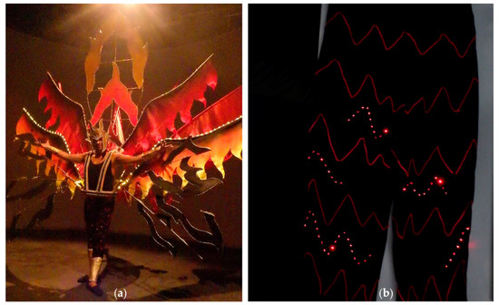 The authors would like to thank Steven Hoyte of Mas Rampage for construction of the costume frame; Carlos Oliveira, Ioannis Anastasopoulos, Mohamad Nour Nashed, and Achala Satharasinghe (of the Advanced Textiles Research Group, Nottingham Trent University), for technical assistance, especially in the fabrication and connection of E-yarns; Alice Cobbin and Evie Cobbin for assistance with the fabrication of the costume; and Tom Fisher and Kath Townsend of Nottingham Trent University for advice on the writing of this paper. The authors would also like to thank Gil Santos for dancing in the costume. Finally, the authors would like to express gratitude to Tatiana Woolley of ABC Dance School, Nottingham, for collaboration on the costume design, fabrication assistance, and organisation of dance performances.
