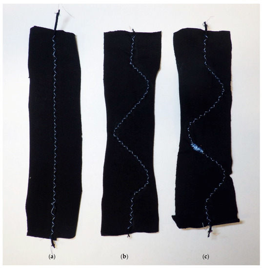 Figure 2a). The initial zig-zag design was slightly less controlled, but a zig-zag pattern with a more ordered structure was chosen for the final design as we believed that this would be easier to implement using an embroidery machine. We assumed that machine embroidery would form a strong attachment between E-yarns and fabric to withstand the stretch and movement of the fabric during performance. A sewing machine (Bernina 1000 Special, Steckborn, Switzerland) was used, with the E-yarn fed through a cording foot to create a wide zig-zag stitch to keep the yarn in place on the fabric surface.