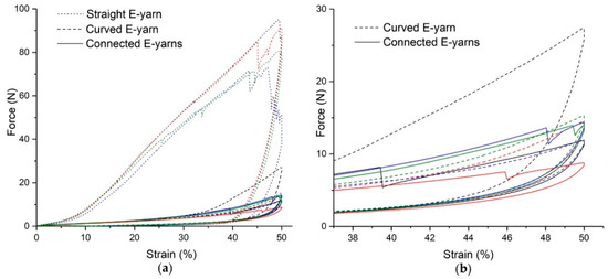 Figure 8. The graph and continuity tests showed breakages in all of the samples containing a straight length of E-yarn. The samples containing a single length of curved E-yarn all remained intact, demonstrating that the curved placement of E-yarn on stretch fabric was effective at preventing E-yarn breakage. Ruptures occurred in all of the samples that incorporated a connection between two pieces of E-yarn. These breakages occurred at between 39% and 49% strain, as shown by the notches in the curves in