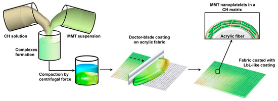 In this manuscript, the production of chitosan (CH) and sodium montmorillonite (MMT) complexes and their use as an FR LbL-mimicking solution for acrylic fibers is proposed. CH solutions and MMT suspensions at different concentrations were mixed and the produced PECs suspension was compacted by centrifugal forces. The resulting gel was then deposited on acrylic fabrics using a simple doctor-blade coating technique in order to obtain a FR finishing characterized by a LbL-like structure and interactions, as schematized in Figure 1, which depicts the approach adopted in this work.