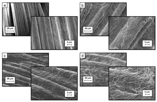 In order to evaluate the changes in the surface morphology of acrylic fabrics after the treatment, the prepared samples were observed by SEM; Figure 3 reports the collected micrographs.