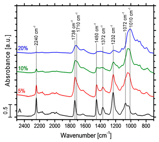 ATR spectra of untreated (A) and CH/MMT-treated acrylic fabrics with 5, 10 and 20% add-ons.