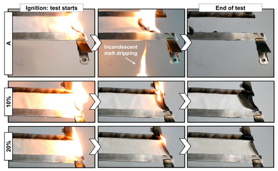 The reaction of untreated and treated fabrics to the application of a flame has been evaluated by horizontal flame spread tests. This test is of crucial importance as it mimics one of the most common scenarios that leads to the ignition and spread of a fire. Figure 5 reports some digital pictures of the fabrics during flammability tests and Table 1 summarizes the evaluated parameters.