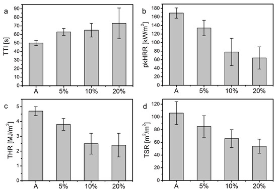 Cone calorimetry tests were also performed in order to provide complementary information for the flammability evaluation. Untreated and treated fabrics were tested under a heat flux of 25 kW/m2, which is typically found in the early stages of developing fires [36]. This heat flux was chosen as in the case of fire, fabrics normally ignite at low heat fluxes, contributing to fire development and spread. Figure 6 collects histograms of the most representative collected parameters, while Table 2 collects the complete set of data.