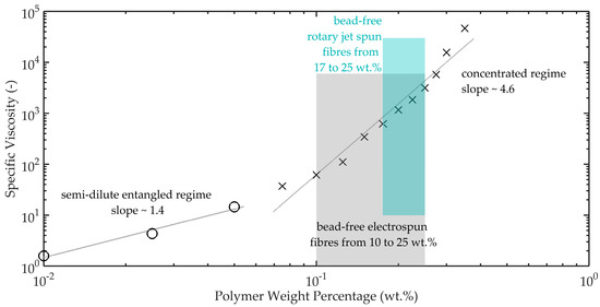 Plot of specific viscosity versus PA6 concentration. The plot shows the transition from semi-dilute entangled regime to concentrated entangled regime, where fibre production starts in electrospinning (>10 wt. %) and rotary jet spinning (>17 wt. %). Specific viscosity is defined as where η represents the solution viscosity and η0 the solvent viscosity.